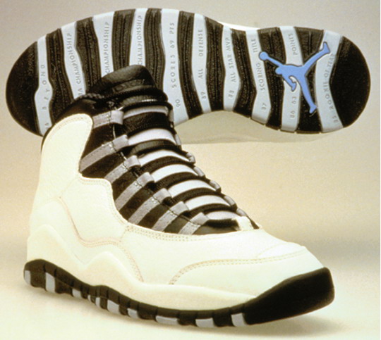 Emerytura i baseball, jak Jordan może odejść kiedy jego popularność była na szczycie. Ludzie z całego Świata zastanawiają się, dlaczego to zrobił ? Z powodu śmierci ojca ? Kto wie. Ale zabiliśmy gęś, która składała złote jajka. Po 21miesiącach MJ wrócił na parkiet, jego pierwszy mecz przeciwko Pacers w Arena Square Market. Byki przegrały 103-96 w dogrywce. Jordan trafił 7 z 28 rzutów. Air Jordan X prezentują kulminację osiągnięć Jordana od 1985 do 1994. Na podeszwie buta, wypisane są jego osiągnięcia w latach 1985-1994: Jeżeli chcesz się z bliska przyjrzeć podeszwie kliknij TUTAJ.