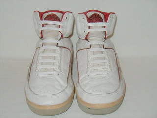 Następny sezon Michael Jordan jest na najlepszej drodze aby zostać supergwiazdą, po wspaniałym wcześniejszym sezonie, w którym dostał nagrodę debiutanta roku, pokonując Olaujown'a (Houston) i Sam'a Bowie'ego (Portland). Ale podczas trzeciego meczu sezonu (29 październik 1985), Jordan doznaje kontuzji. Po niefortunnym lądowaniu po wsadzie Jordan łamie kość w lewej stopie. Kolejna seria butów Air Jordan II zostały WYPRODUKOWANE WE WŁOSZECH. Dlaczego właśnie we Włoszech. Nie mam żadnego pomysłu. Być może było to z powodu sztucznej skóry jaszczurki na bucie albo czymś innym. Kto wie...