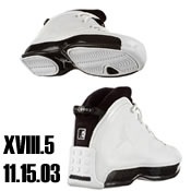 Air Jordan XVIII mają kolejny debiut w tym sezonie, tym razem po drobnych modyfikacjach. Air Jordan XVIII.5 mają lśniącą pełno ziarnistą skórę, która przechodzi na boczną część buta w perforowane unikalne logo Jumpman. Buty mają być dostępne w sklepach 15 listopada 2003 roku, ich cena będzie wynosiła około 170$ (Nie będę przeliczał aby Was nie odstraszyć :) ). Na początku będą dostępne tylko w kolorze biało-czarnym.
