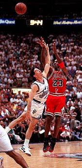 8. Zwycięski rzut z wysoku nad Bryonem Russelem w pierwszym meczu Finałów NBA 1997 roku przeciwko Utah. |